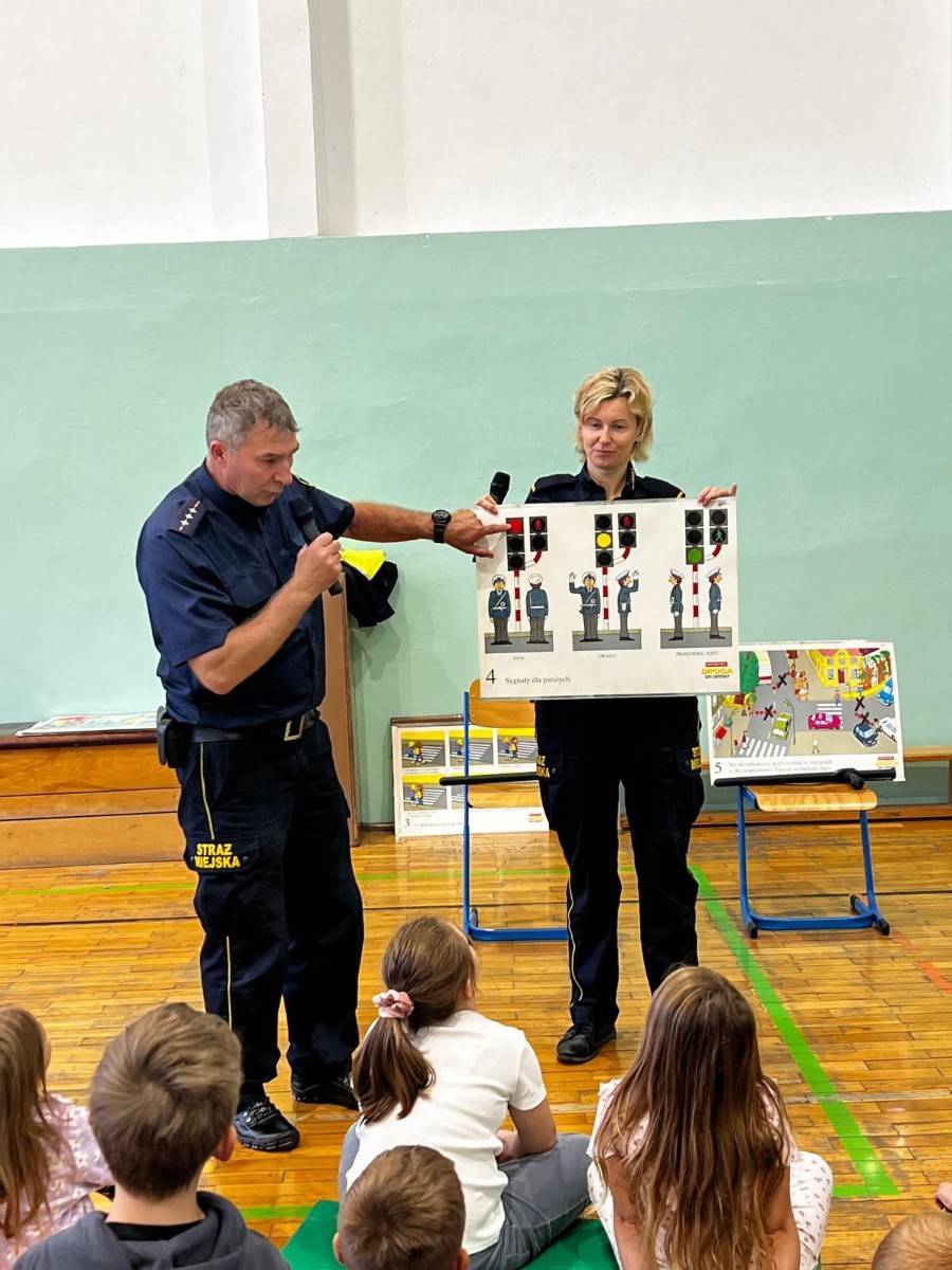 W ubiegłym tygodniu odwiedzili nas przedstawiciele Straży Miejskiej. Spotkanie było skierowane do uczniów klas pierwszych, którzy z dużym zainteresowaniem uczestniczyli w zajęciach. Funkcjonariusze opowiedzieli o swojej pracy, a także przypomnieli zasady bezpieczeństwa w drodze do szkoły i podczas zabawy.