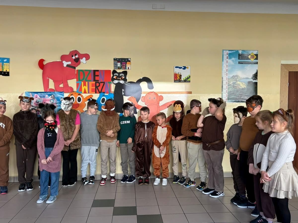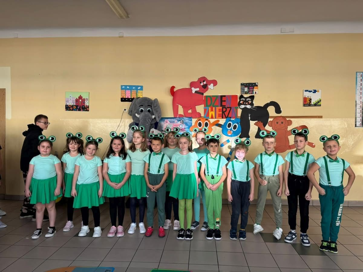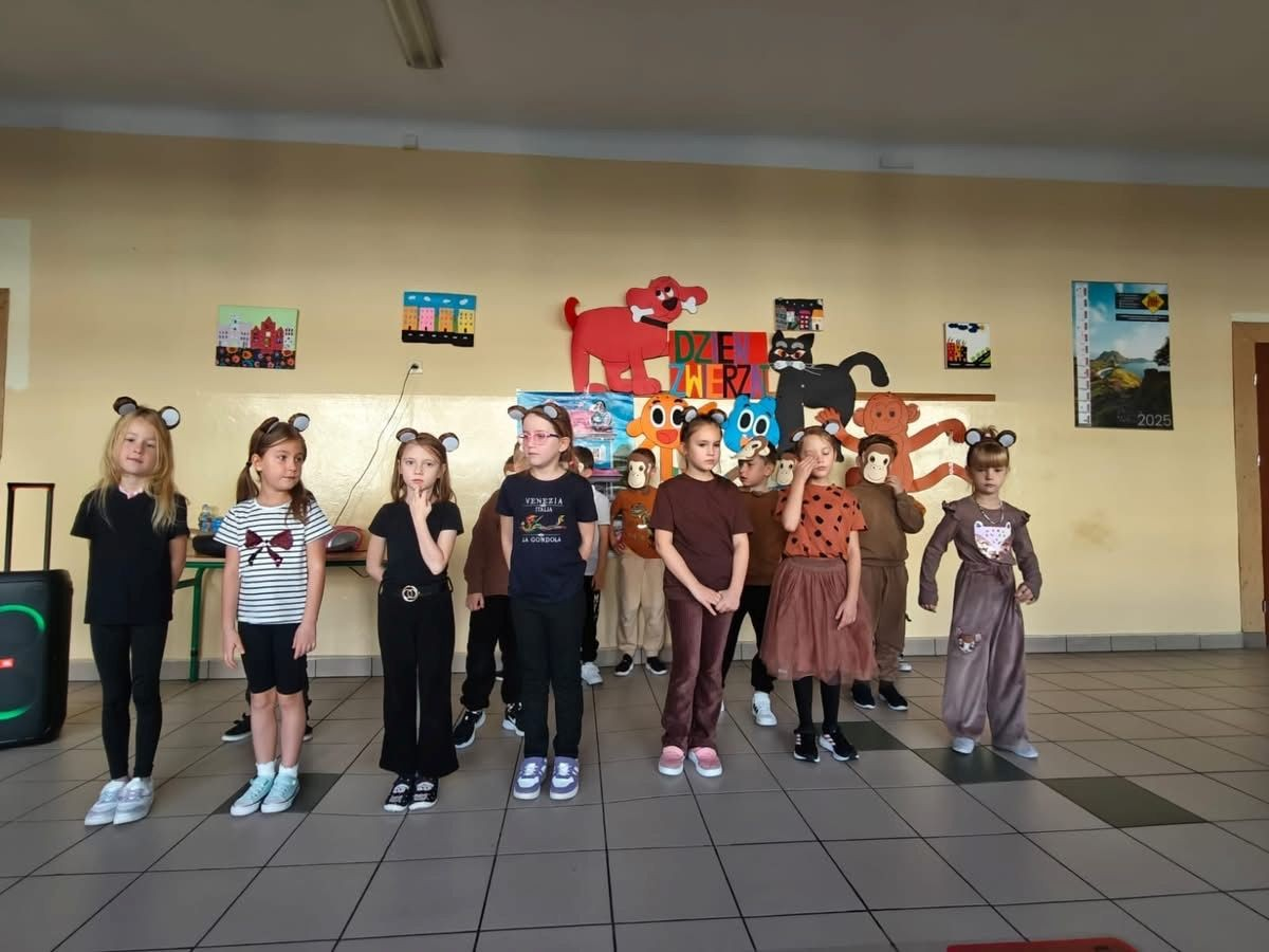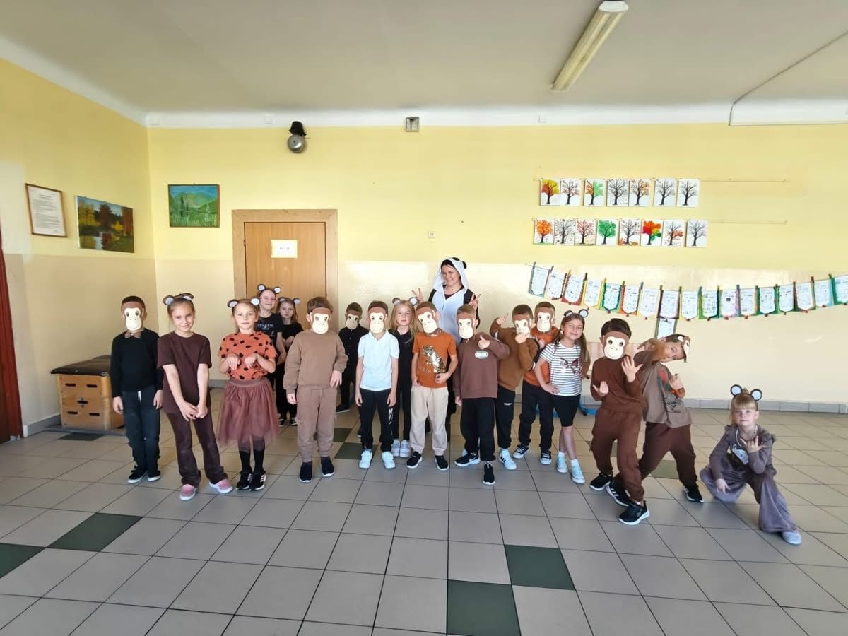 22 października 2025 r. w naszej szkole odbył się koncert, w którym klasy młodsze prezentowały piosenki o zwierzętach. Gościem spotkania była maskotka naszej szkoły Słoń King, którego dzieci z radością przywitały. Uczniowie dowiedzieli się wielu ciekawostek o zwierzętach, przygotowanych przez pomysłodawcę wydarzenia p. Jolantę Zamorę. Dziękujemy wszystkim nauczycielom i uczniom, którzy bardzo się zaangażowali i przyczynili się do wspaniałego muzycznego spotkania.