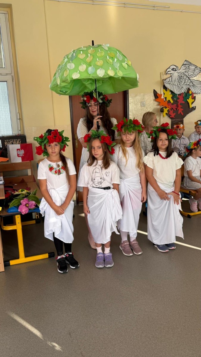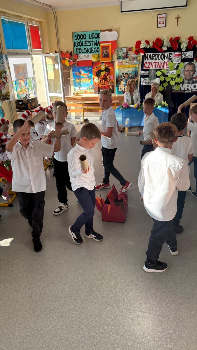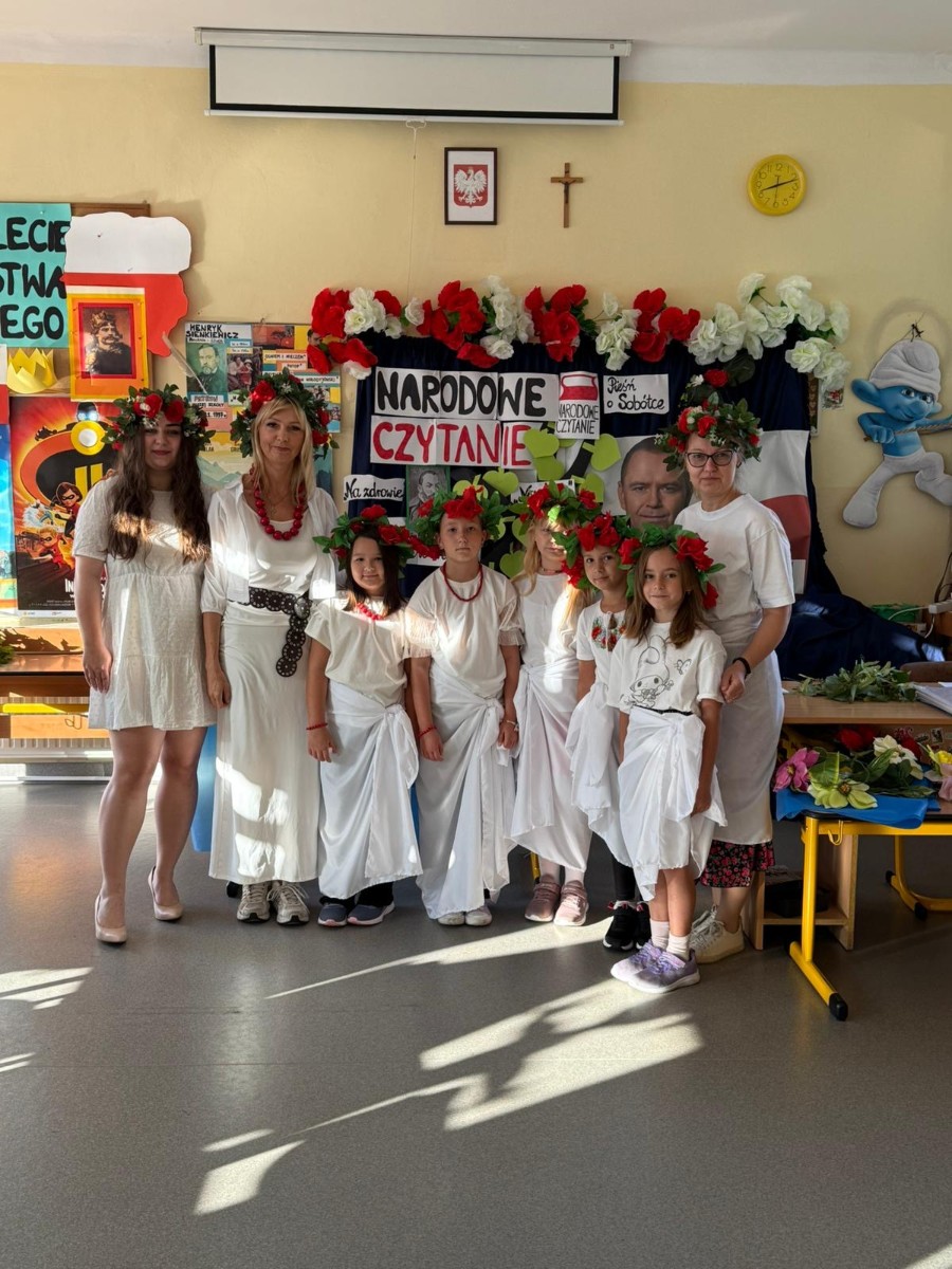 Narodowe Czytanie 2025 zostało zorganizowane również w klasach drugich. Była to inicjatywa p. Jolanty Zamory i klasy 2 b. W tym roku bohaterem spotkania czytelniczego był Jan Kochanowski. Pani Dyrektor Elżbieta Gocyła i pani wicedyrektor Małgorzata Rolka pięknie przeczytały utwory Jana Kochanowskiego: „Na zdrowie”, „Na lipę” oraz fragmenty „Pieśni świętojańskiej o Sobótce”. Uczniowie z uwagą słuchali poezji. Rozmawiali o wartościach, takich jak zdrowie, piękno przyrody, polskie tradycje i obrzędy. Następnie klasa 2 b zaprezentowała inscenizację sobótki. Spotkanie dostarczyło uczniom wielu wrażeń.