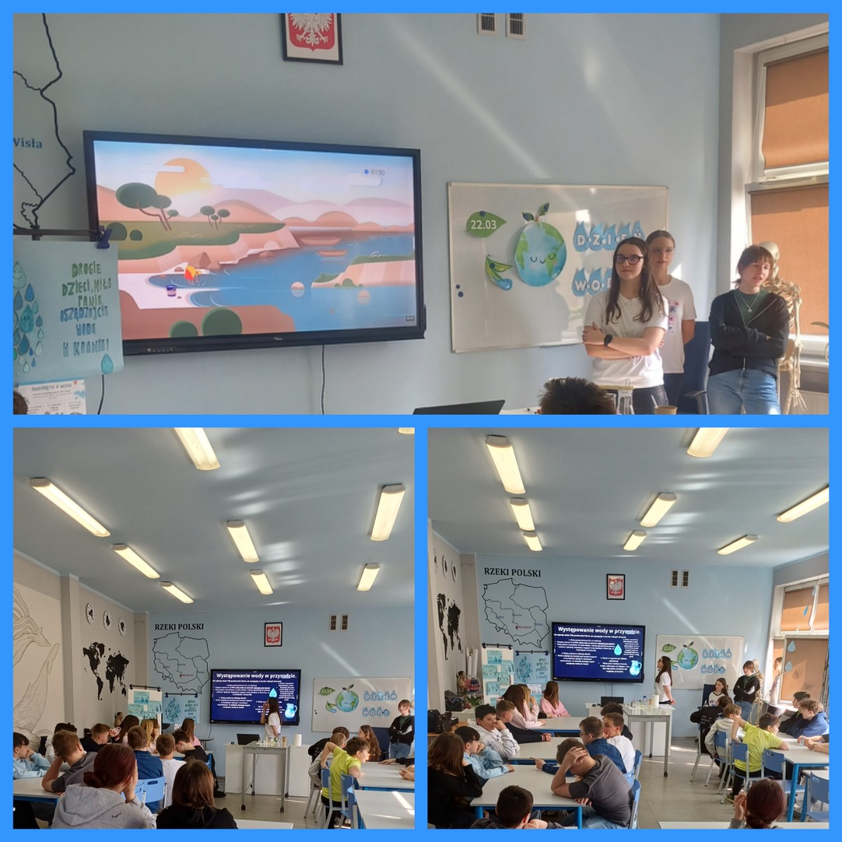 Jednym z głównych punktów programu była prezentacja multimedialna przygotowana przez uczennice klasy 8c. Nadia, Weronika, Marysia oraz Julia w przystępny i ciekawy sposób przedstawiły informacje dotyczące zasobów wodnych na świecie, problemu ich zanieczyszczenia oraz sposobów oszczędzania wody na co dzień. Prezentacja wzbogacona była o krótkie filmy, które pomogły lepiej zrozumieć omawiane zagadnienia.