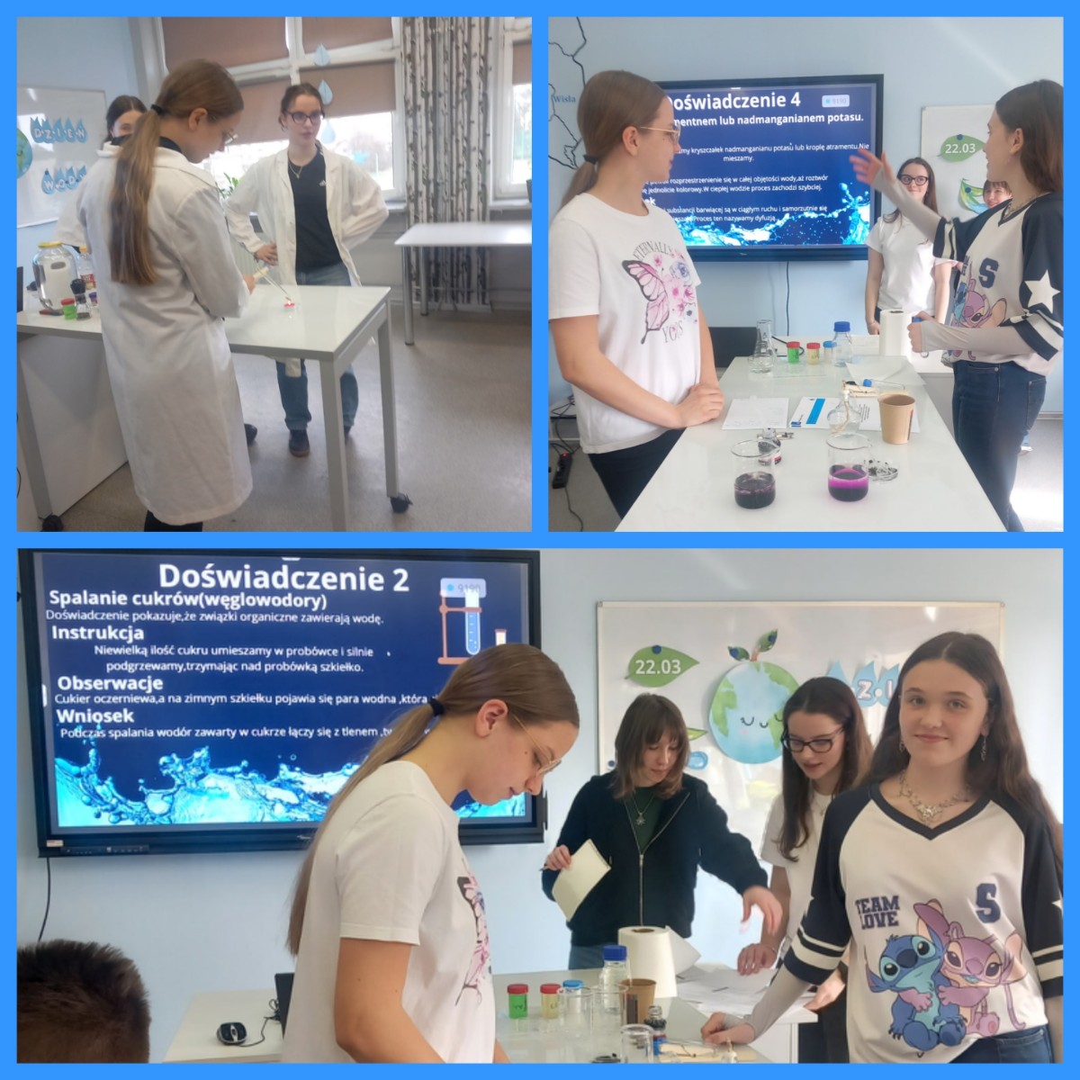 Dużym zainteresowaniem cieszyły się również pokazy doświadczeń chemicznych związanych z wodą, przygotowane i przeprowadzone przez uczennice. Podczas eksperymentów uczniowie mogli zobaczyć m.in. właściwości wody jako rozpuszczalnika, zjawisko dyfuzji oraz mogli przekonać się o obecności wody w węglowodanach. Pokazy były nie tylko efektowne, ale także pouczające i zachęcały do samodzielnego odkrywania tajników nauki. Zajęcia zostały przeprowadzone nie tylko dla kolegów i koleżanek ze szkoły, ale również dla przedszkolaków, których gościliśmy w naszej szkole.