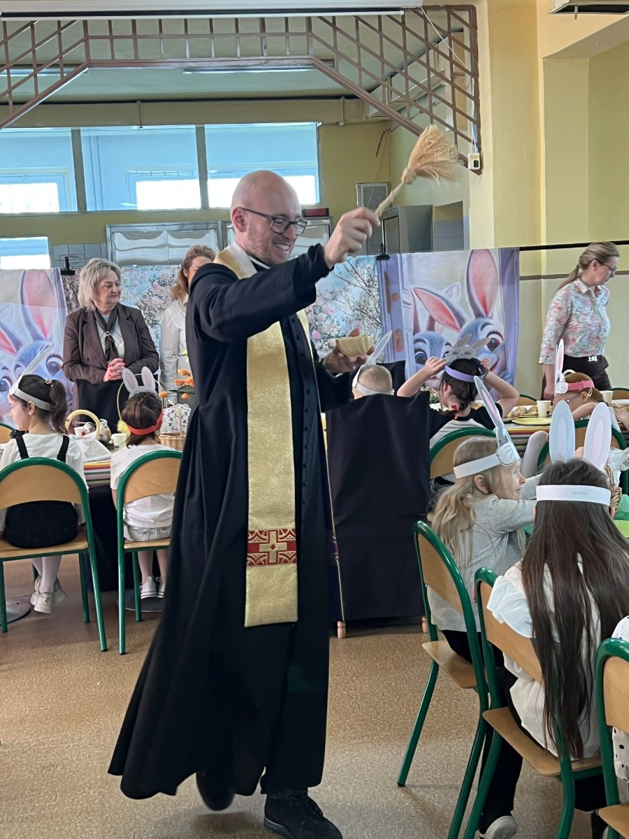 W dniu dzisiejszym odbyły się w naszej szkole uroczyste śniadania wielkanocne. Inicjatorami tego wydarzenia były nauczycielki: Jolanta Zamora, Maria Kęsy, Marlena Pompa i Anna Woldan. Tradycyjnego poświęcenia pokarmów dokonał ksiądz Marcin, który dodatkowo śpiewem pokazał nam jak radośnie oczekiwać zmartwychwstałego Jezusa.
